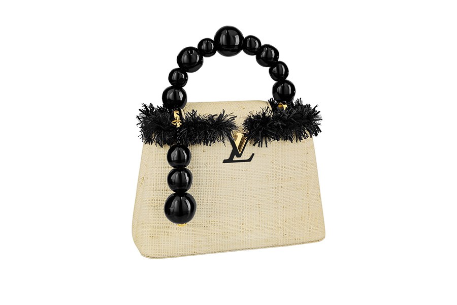 Jean-Michel Othoniel设计的ARTYCAPUCINES手袋为赏心悦目的优雅精品,设计上先精心挑选拉菲草,再以繁复手工编织手袋主体。手袋顶部饰边为手工刺绣,使用高级时装常见的黑色绸缎,而手柄则以大型黑色树脂珠制成,风格类似这位法国艺术家最著名的大型作品,例如巴黎地铁入口的《夜猫族的凉亭》(Le Kiosque des Noctambules)。饰有三颗引人注目的树脂珠的手袋,让这款设计成为便于携带的Othoniel奢华雕塑作品。