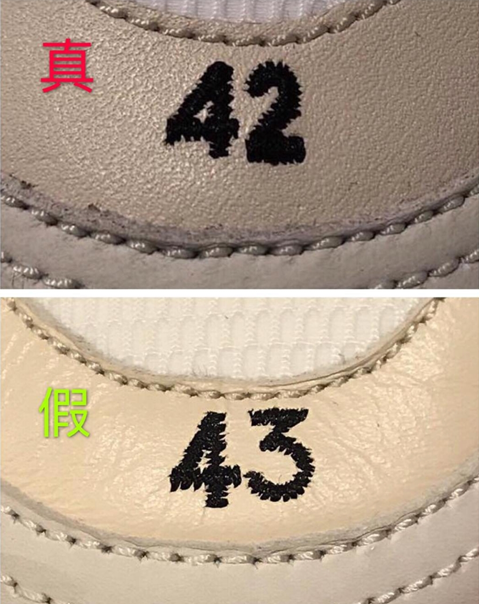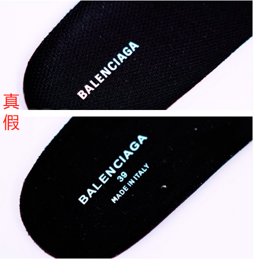 仿品鞋垫无网面覆盖,LOGO扁平,另印有鞋子尺码与产地。