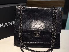 小香顶尖复古黑色油蜡皮女包,菱格形银色五金链条单肩手提包