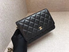Chan.l Classic wallet on chain Lambskin Gold-tone Metal 菱格車縫線 經典款小羊皮黑色 银色五金金屬