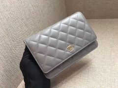 Chan.l Classic wallet on chain Lambskin Gold-tone Metal 菱格車縫線 經典款小羊皮灰色 银色五金金屬