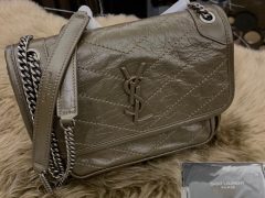 圣罗兰包包图片价格中文官网 YSL 卡其色 中号NIKI褶皱绗缝真皮链条翻盖包,饰以真皮包覆的 YSL 标志,配以可单肩斜跨两用的真皮加固肩带链。