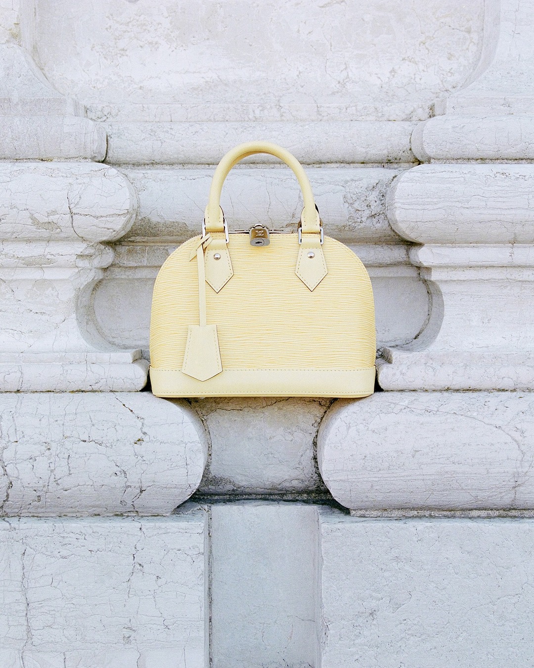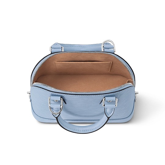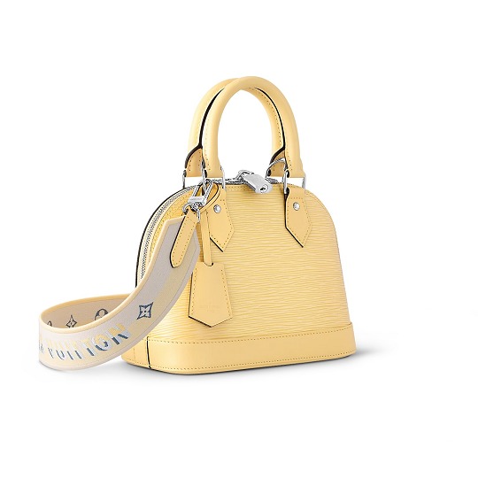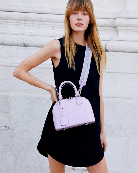 Alma BB 手袋換上飛羽黃、玫瑰粉、天青色和瀉湖藍4種淡彩色調,搭配 Louis Vuitton 標識刺繡和 Monogram 花簇裝飾的同色提花寬肩帶,標志性挂鎖和鑰匙包作爲點睛,玲珑包型在低飽和冰泣淋色烘托下顯得清新可人。
