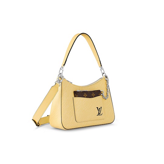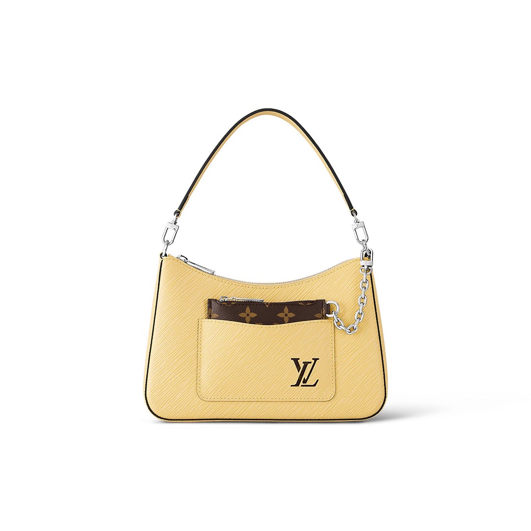 Marelle 手袋采用 Hobo 單肩包+拉鏈包二合壹設計,透過正面口袋的镂空 LV 字母可窺見帆布袋上的 Monogram 圖案,銀色鏈條將兩者連接,也可以拆開單獨使用。包包配有可替換的短提手和長肩帶,可以實現多種搭配組合方式。本季推出全新飛羽黃配色,爲夏季穿搭增添壹抹亮色。