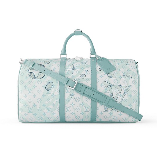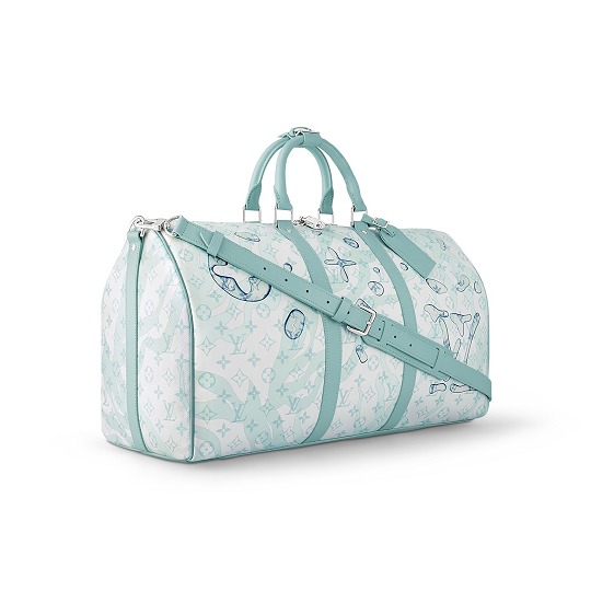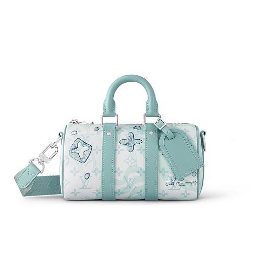 白色款推出 Keepall 25 迷妳波士頓包、Steamer 迷妳挎包、Discovery 雙肩包、Keepall 旅行袋以及手拿包、盥洗包、錢夾等單品,搭配銀灰色皮革飾邊,淺色背景讓水滴呈現清透觀感,尤其適合清爽的夏日穿搭。