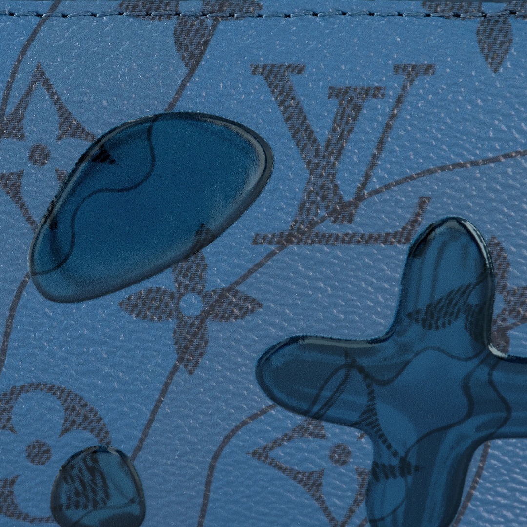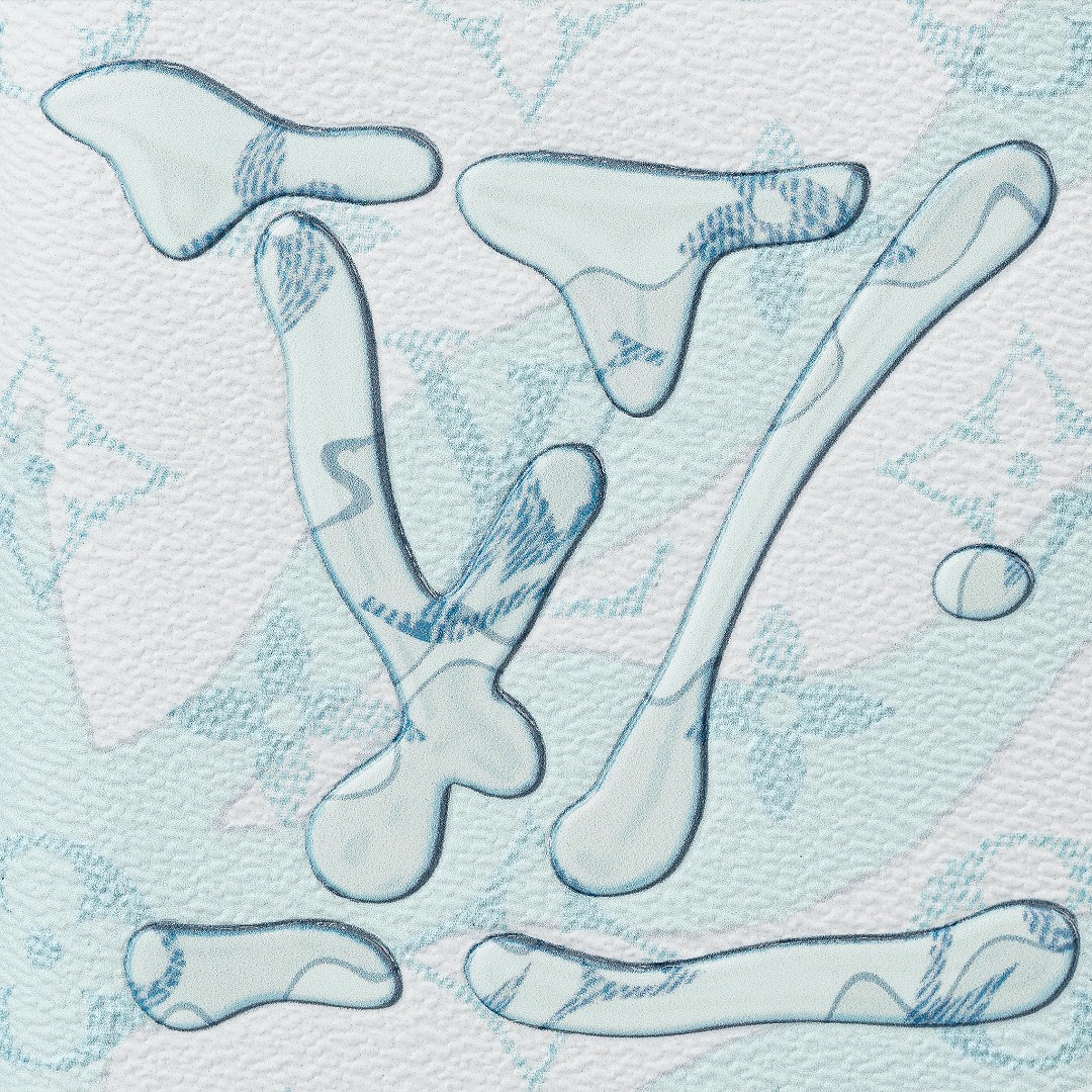 Monogram Aquagarden 系列包款以白色和海軍藍色塗層帆布爲背景,通過創意噴墨工藝令 Monogram 花卉和 LV 字母呈現透明的立體水滴觀感,並在底部疊印若隱若現的水草圖案,營造出水墨畫般的意境。