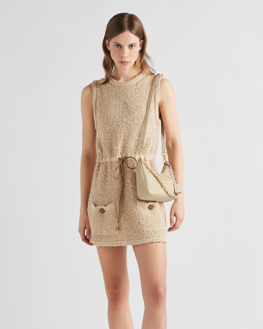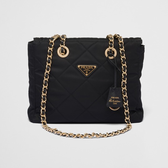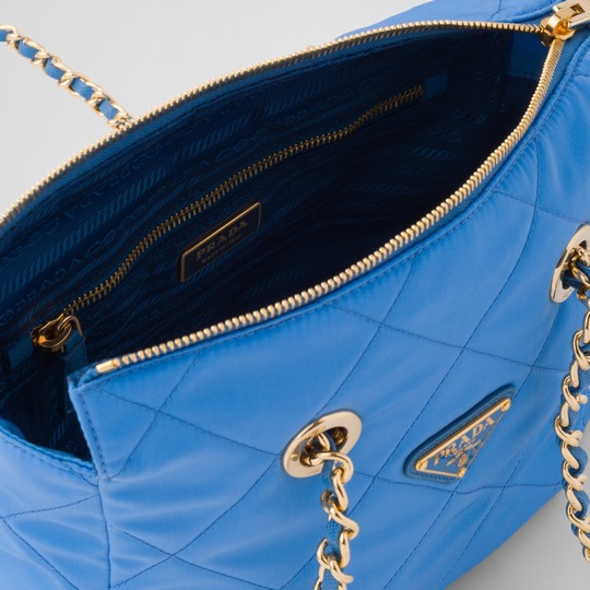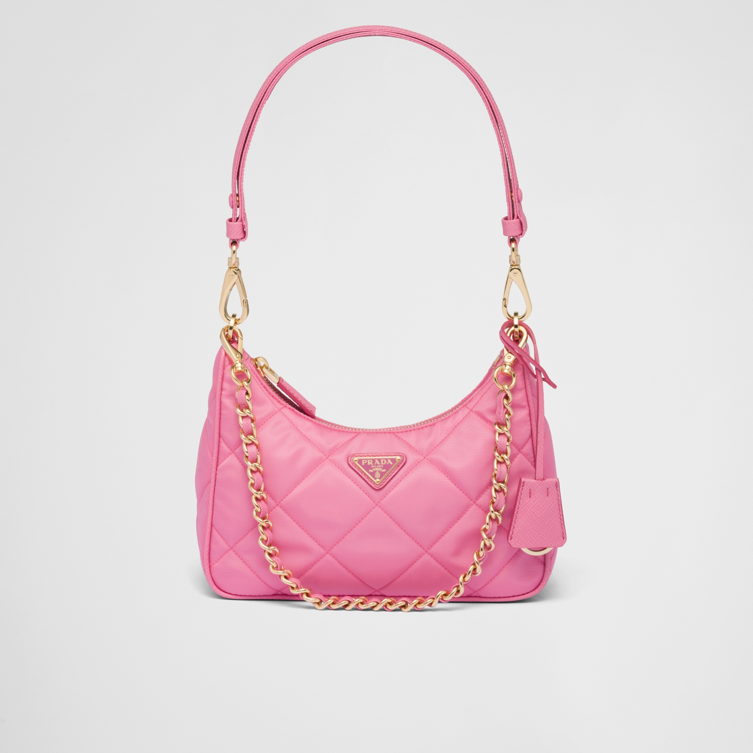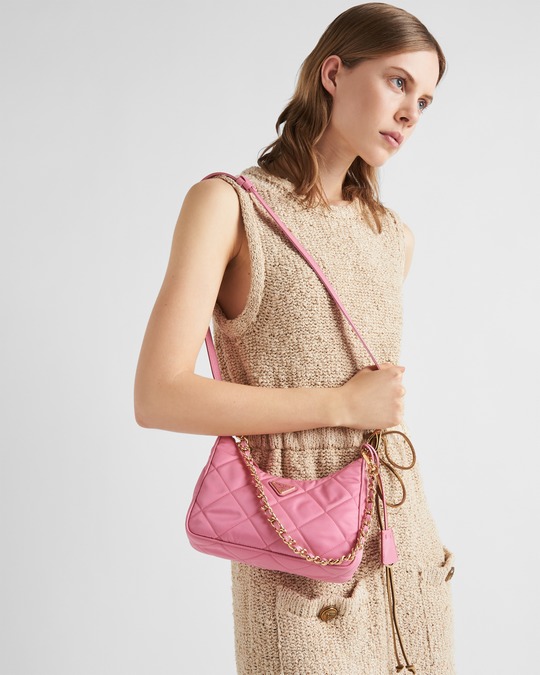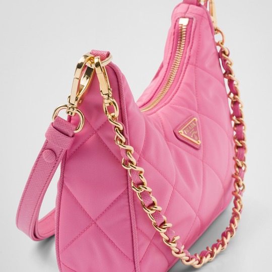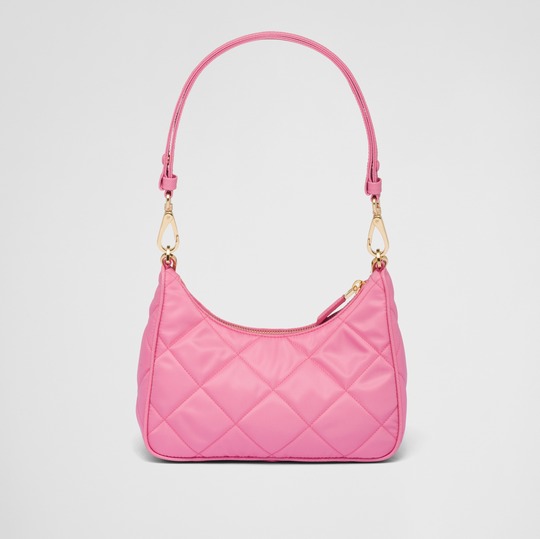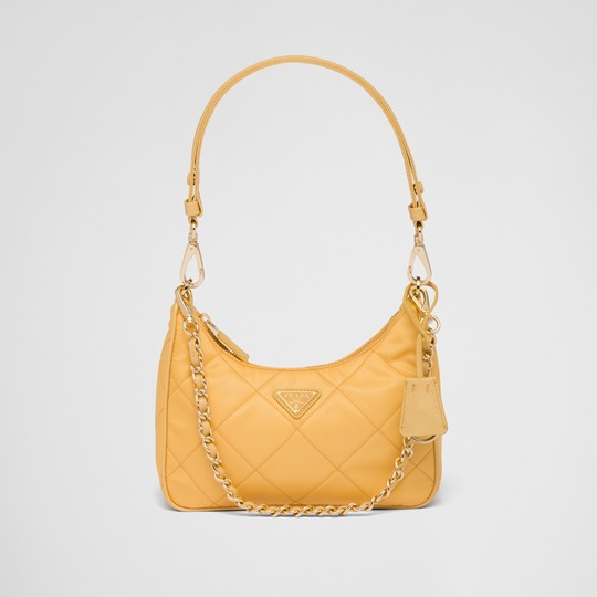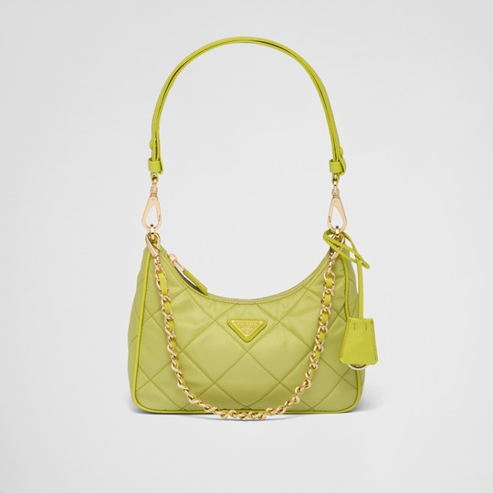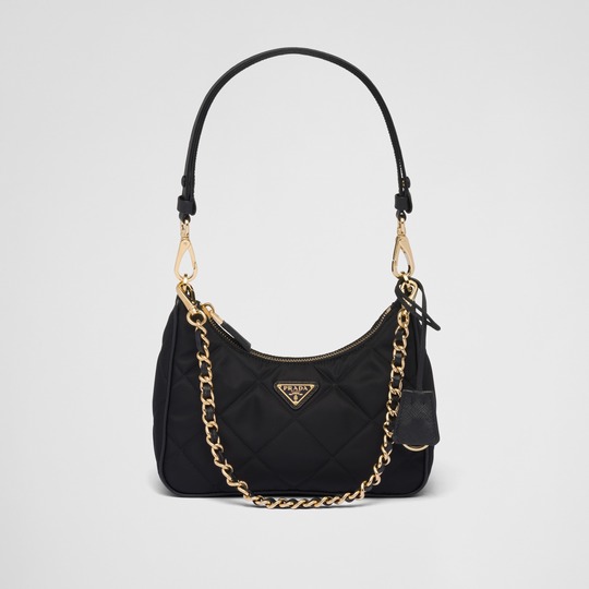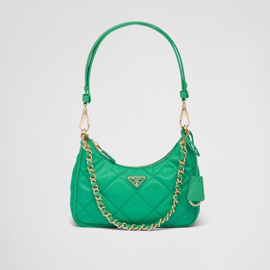 頗具人氣的 Hobo 單肩包結合再生尼龍材質和 PRADA 工匠技藝,並配有可拆卸的皮革鑰匙環、皮革穿鏈裝飾和皮革短肩帶,可在手拎和單肩中自由轉換。