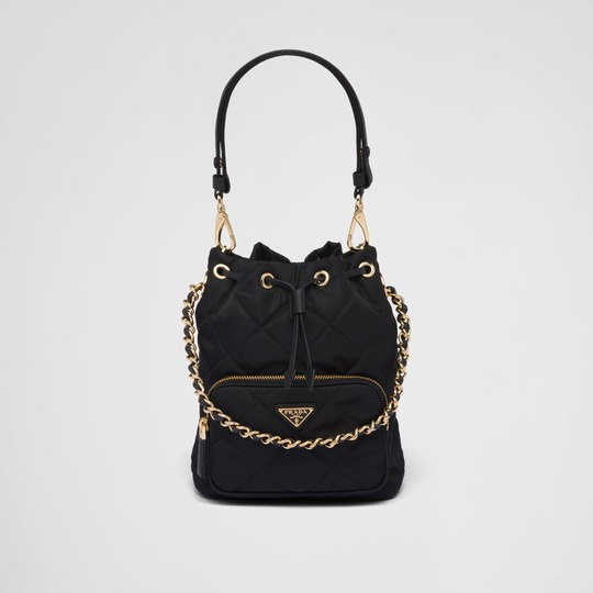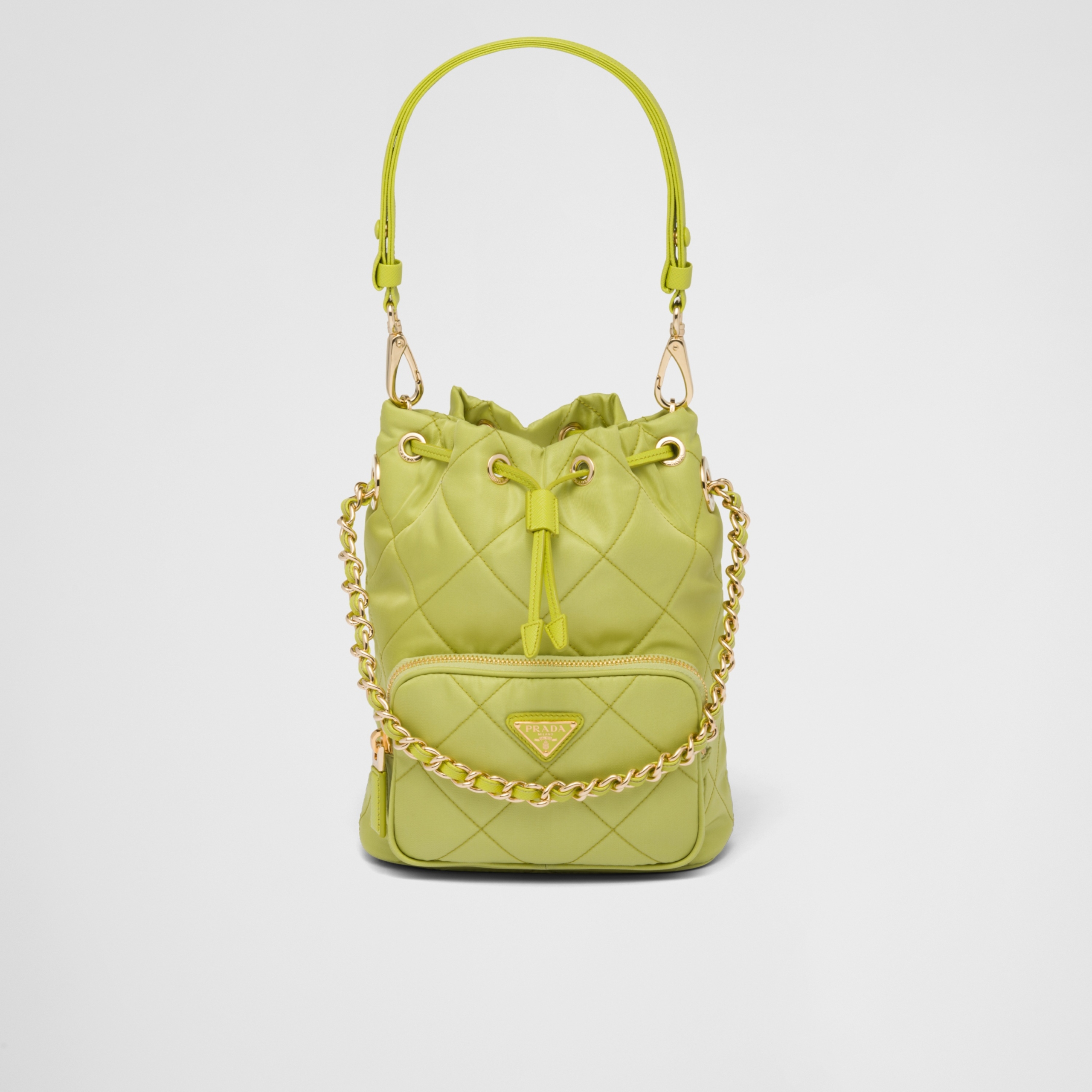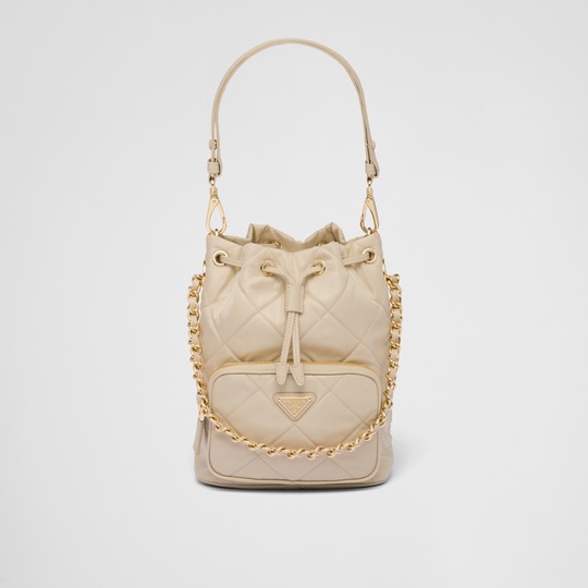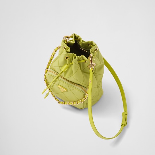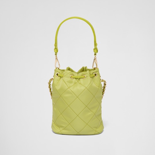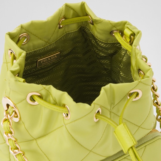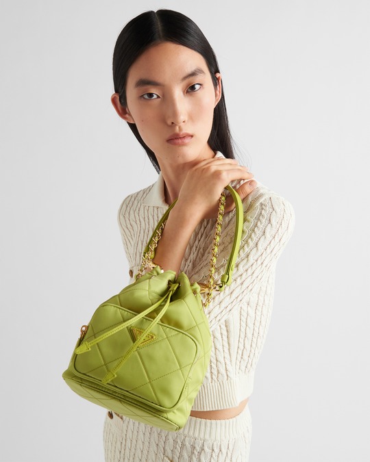小巧的水桶包以 Re-Nylon 再生尼龍面料打造,具有輕盈防水和環保等優勢。新作亮點是采用襯墊設計,縫線勾勒出飽滿蓬松的菱格紋圖案,搭配皮革穿鏈裝飾和頂部提手,流露出青春又休閑的風格。