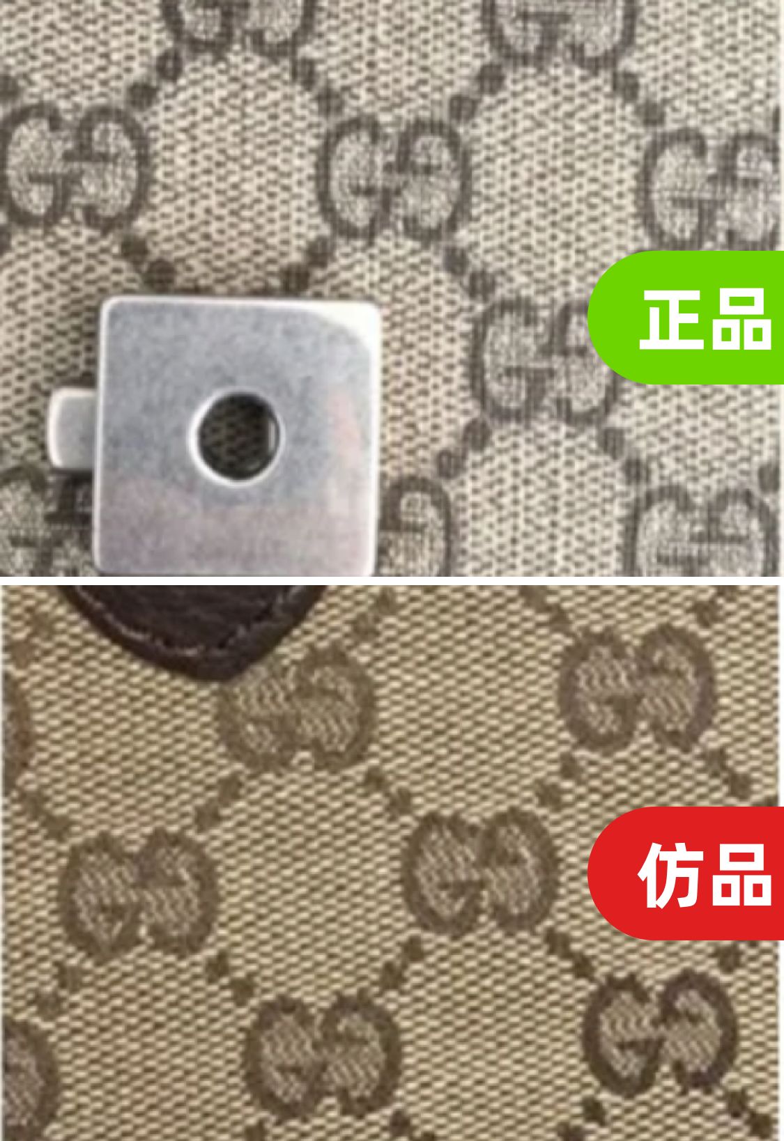 對比GUCCI的LOGO,仿品的G偏肥大,上面的勾較爲尖銳,熟悉GUCCI標志的人,壹看到下圖就知道是仿品的