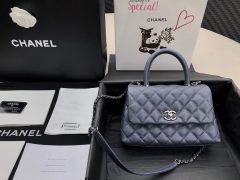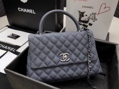 香奈儿口盖包配手柄 coco handle bag 中号 灰色颗粒压花 鱼子酱牛皮