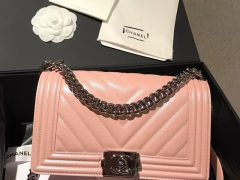 Boy珍珠粉色牛皮小球纹大V格口盖包 银色亮金链单肩斜挎包25cm